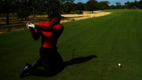 De bal van de speler rolt onder de laaghangende takken van een struik.